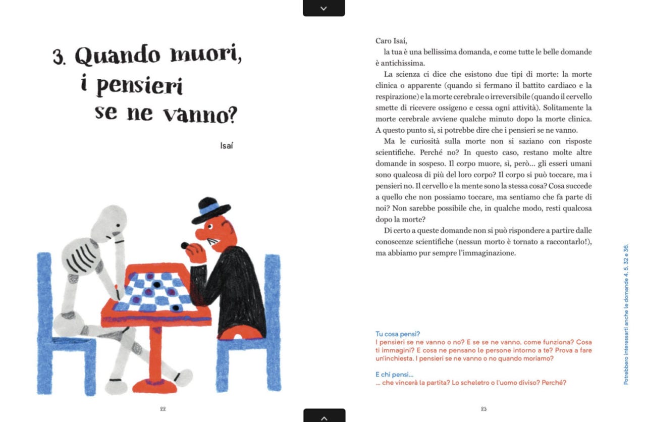 Chiedersi che cos’è ci aiuta a vederla meglio, come parte essenziale della vita. Come accade nell’albo illustrato Così è la morte?, nel quale Ellen Duthie e Anna Juan Cantavella hanno raccolto le domande di un pubblico dai 4 ai 15 anni, selezionandone alla fine 38 e provando a entrarci dentro – purtroppo il libro non è più acquistabile perché la casa editrice Logos ha chiuso lo scorso dicembre, ma per fortuna ci sono le biblioteche.